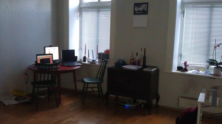 I am sitting next to a window, on a red-ish round table, gazing at the park next to me, wondering about all the sporty Norwegians, running around (mind there is still snow on the ground), playing with kids, chasing dogs, every once in a while a car passes by but all in all a wonderful (quite comforting) surrounding.
