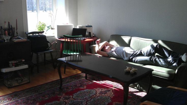 We wheeled the sofa down the hill, put it on the platform, un-wheeled it, to make the putting into the train easier, which worked out surprisingly well. A and I, both developed a sense of pride, a sense of accomplishment, that was until we realized the stares. The looks of disbelief, the shaking heads, the trying to approach us with a witty line but not being able to. And A and I smiled back at everyone that met our eyes. We somehow put our sofa on the train, made sure it wasn’t in anyone’s way and we sat on it, while driving. People were getting on and off the train, trying to check out, what our deal was but we managed to not get into a discussion as to why we were doing this. We stopped at the closest train station to us, which is the sketchiest part of Oslo but still managed to deliver our sofa home safely.